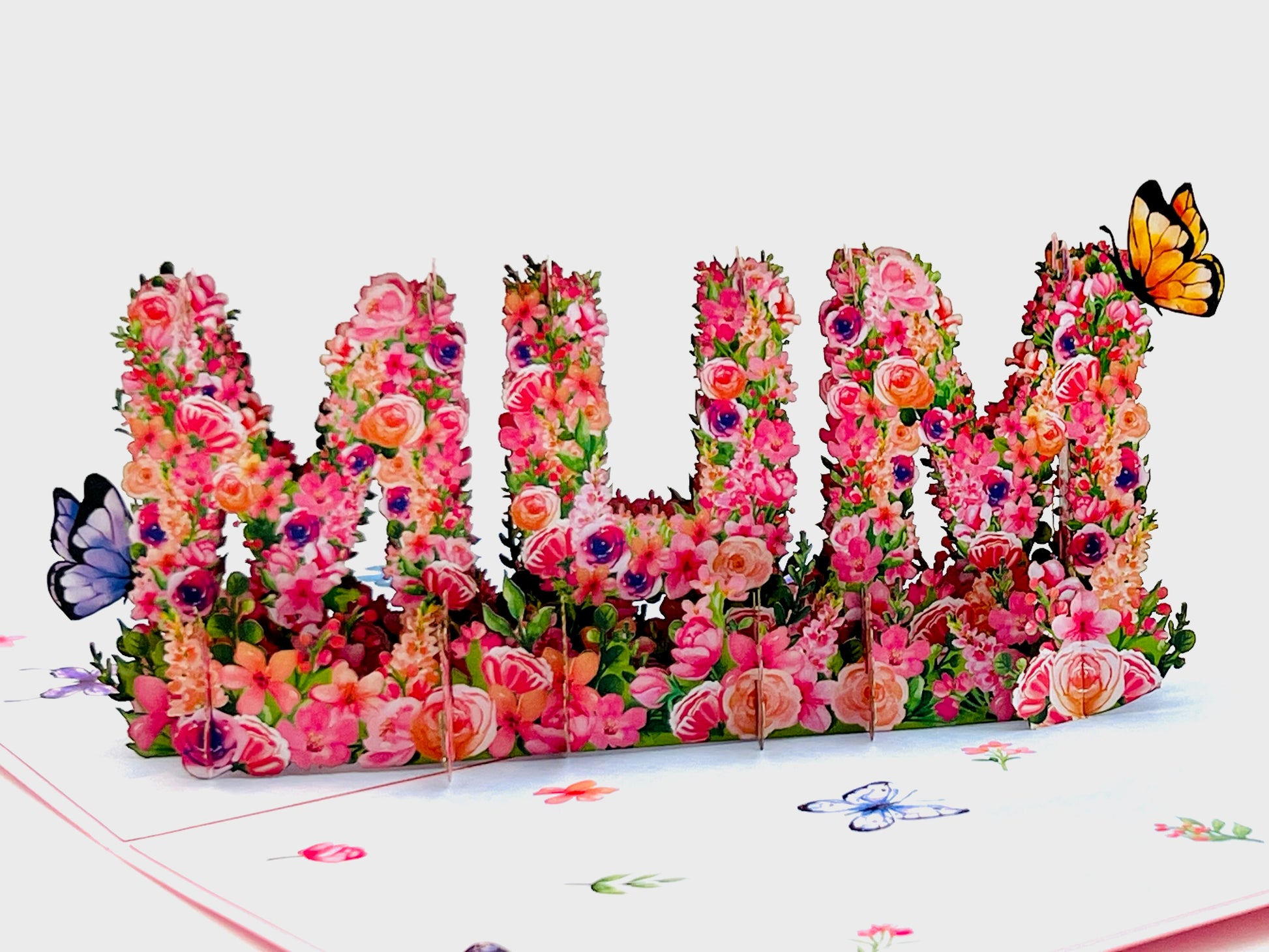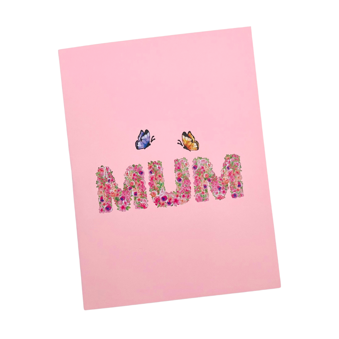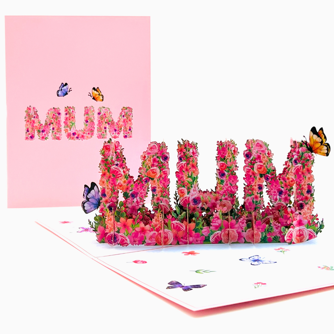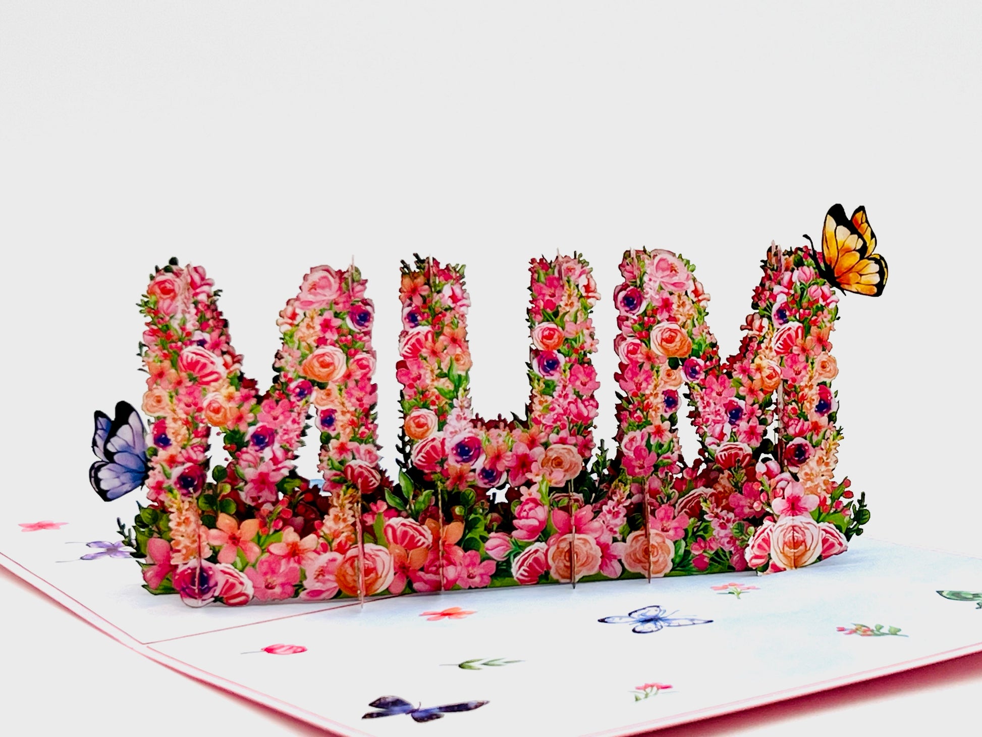Delight your loved one with our exquisite pop-up card, an ode to all the wonderful mothers out there. Intricately designed with a burst of vibrant flowers forming the word "MUM", this card is a beautiful surprise waiting to unfold.
