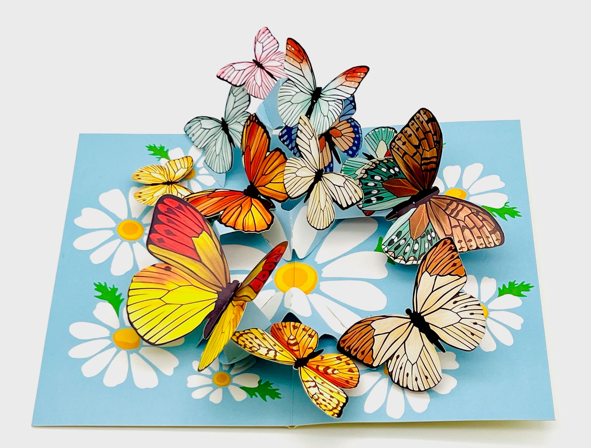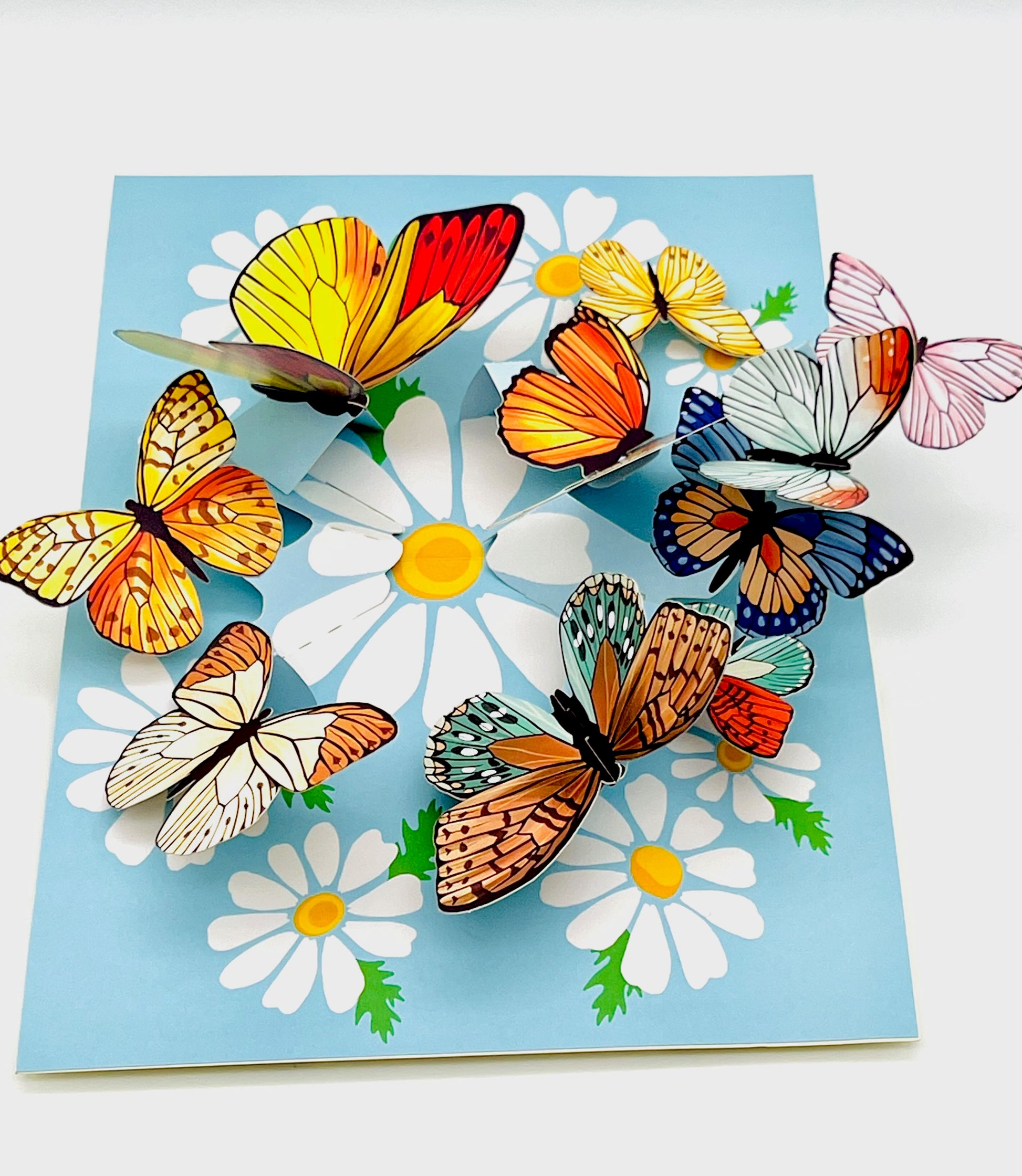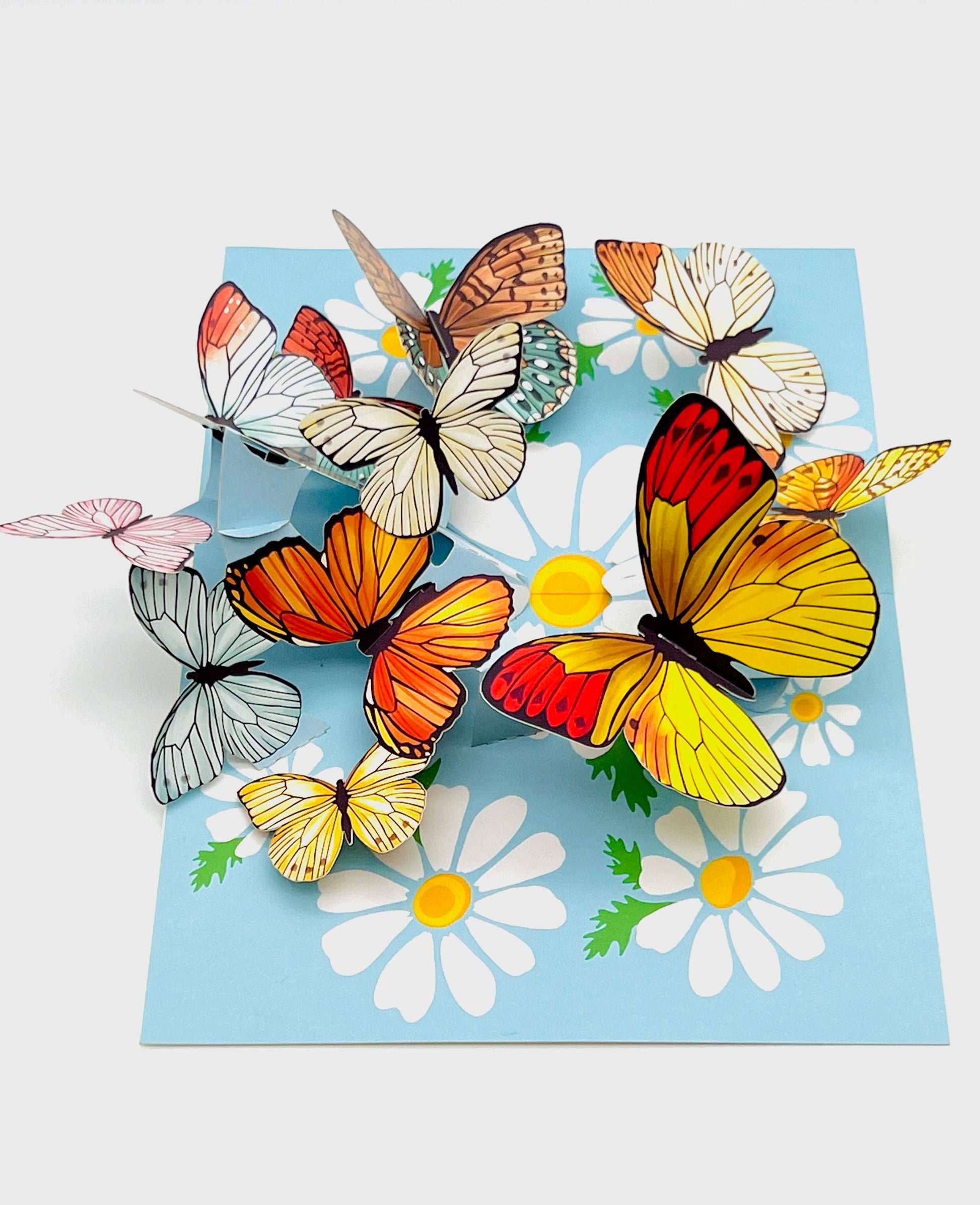 Experience the magic of nature with our meticulously crafted Butterfly Pop-Up Card. This beautifully designed card unfolds to reveal a vibrant collection of butterflies hovering over serene daisies. Each butterfly is detailed with unique colours and patterns, making the card a mesmerising spectacle.