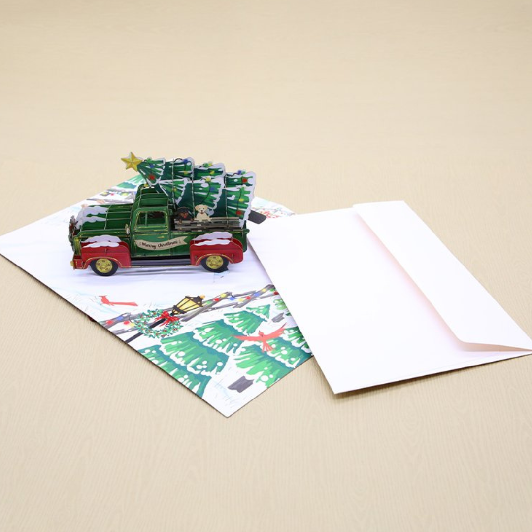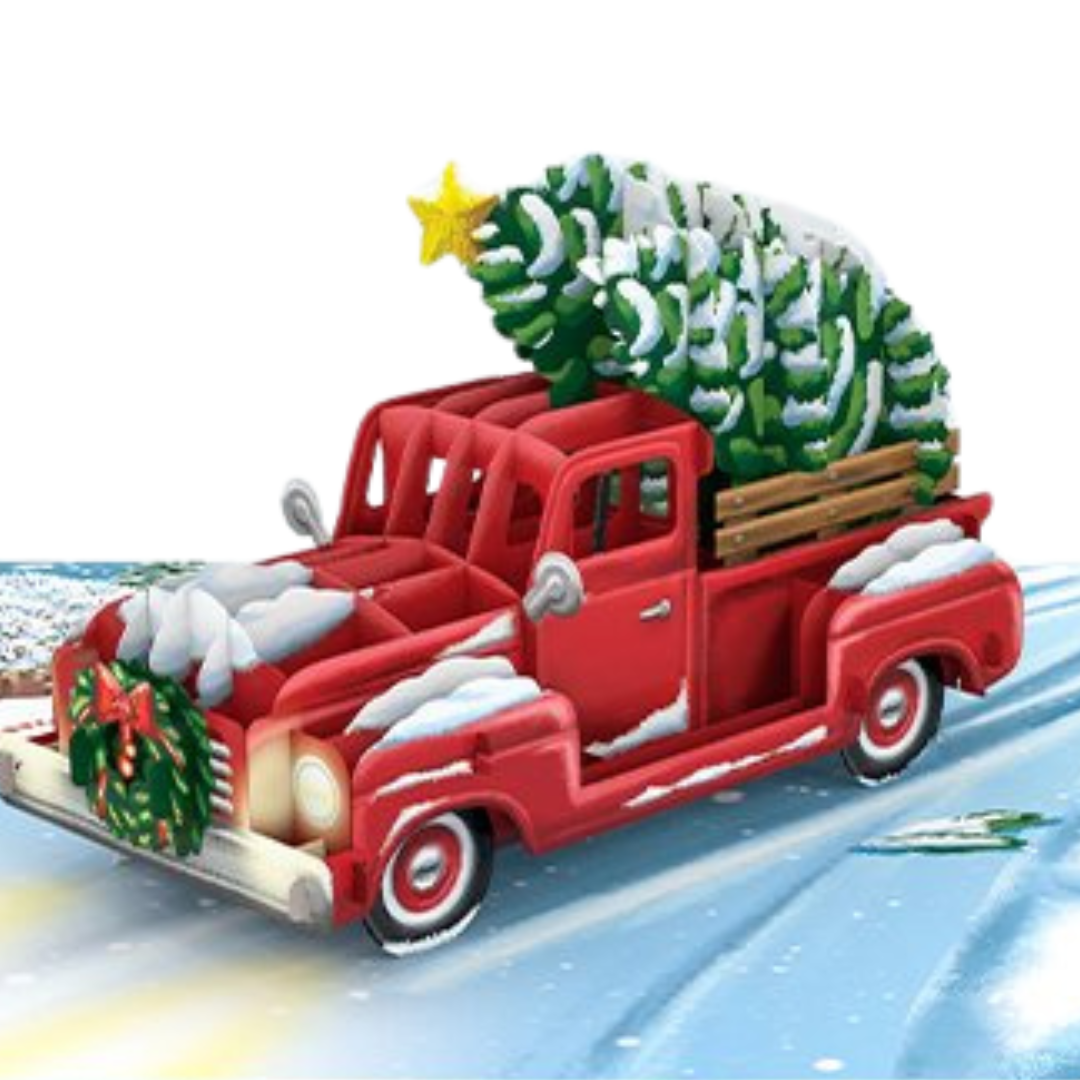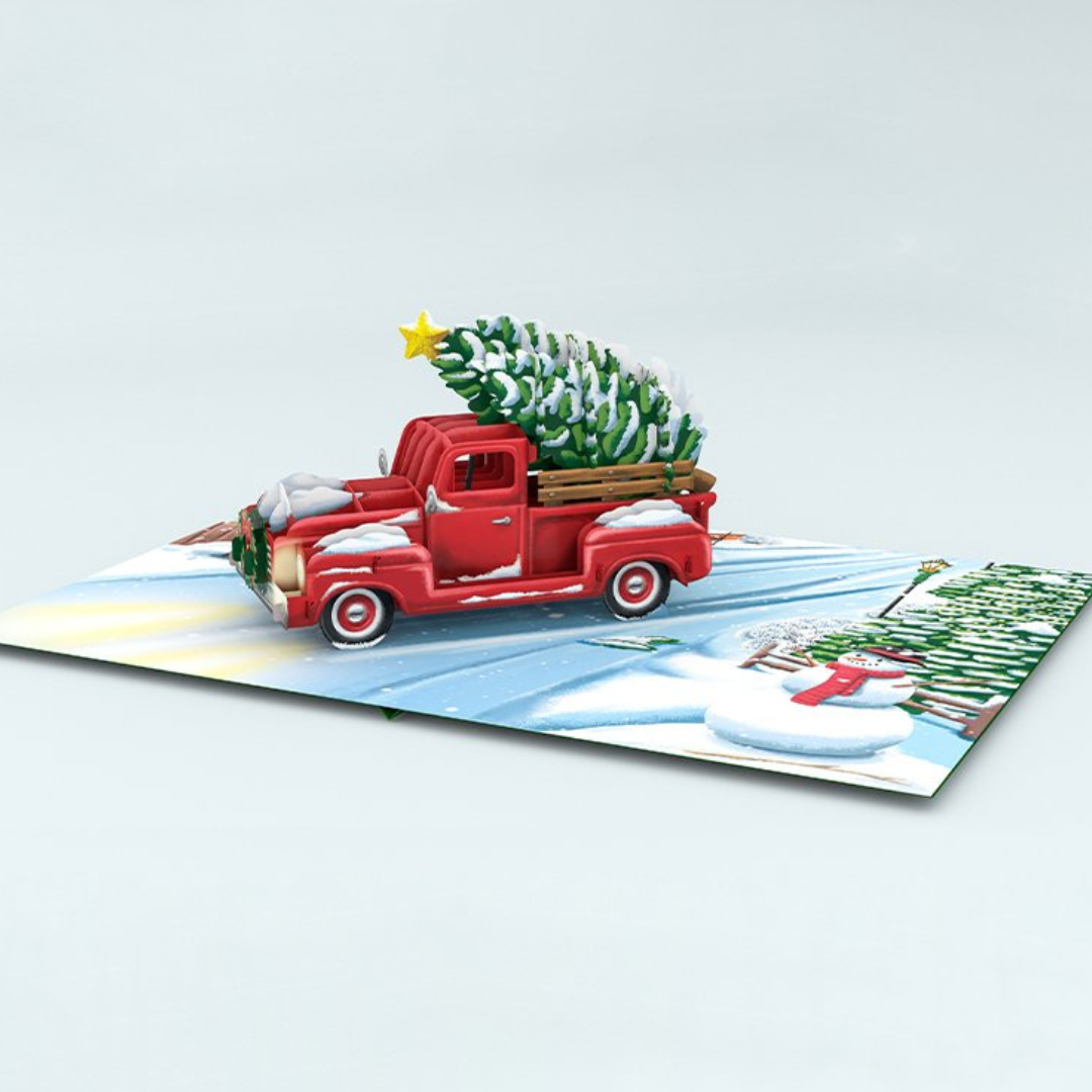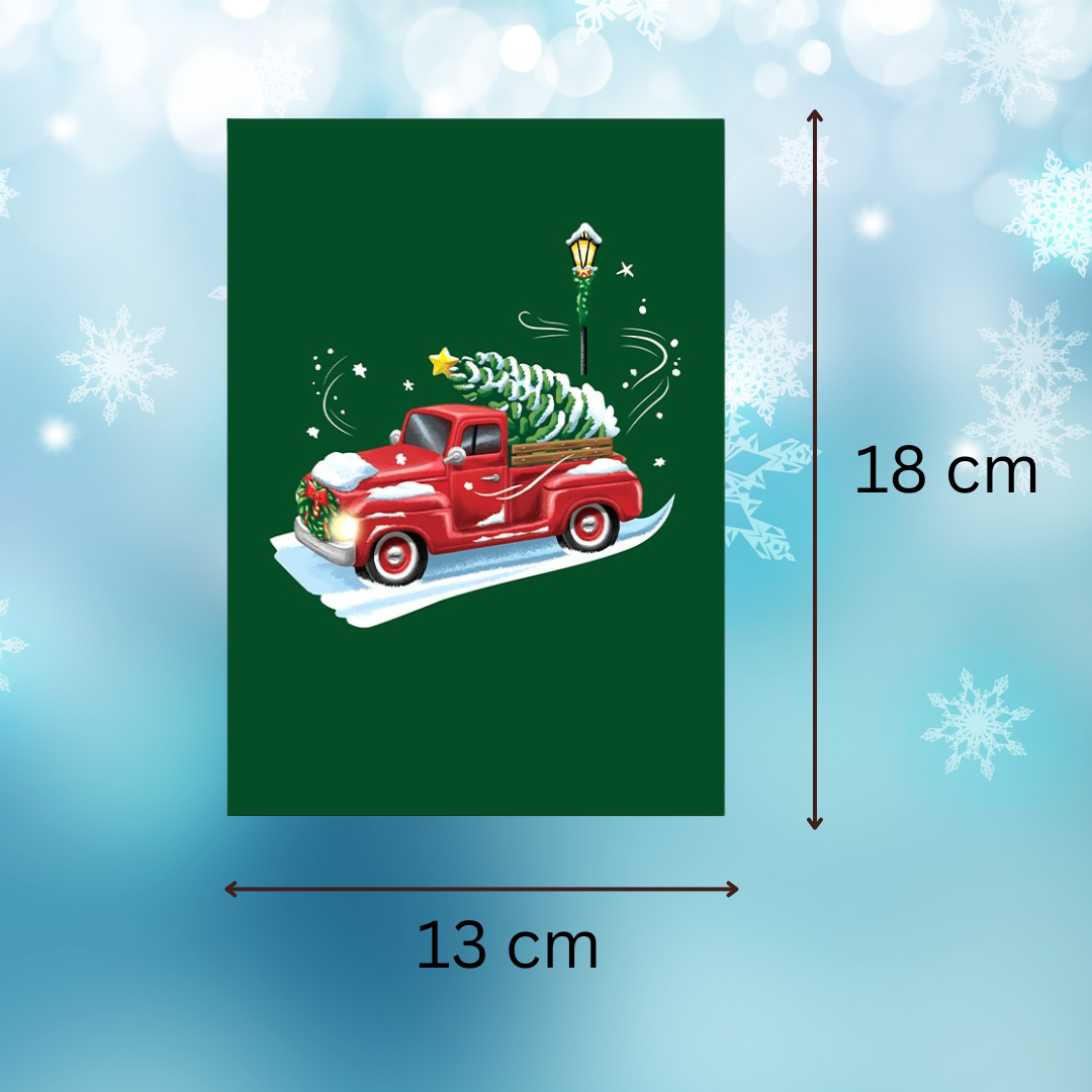 This festive 13x18cm pop-up card features a vibrant red vintage truck carrying a lush green Christmas tree topped with a bright yellow star. The truck, detailed with snow accents and a decorative wreath on the front, brings the joy of the holiday season to life as it drives down a snowy road. The snowy landscape on the card adds charm with a snowman, trees, and a festive atmosphere. When opened, the card reveals the 3D truck, making it an interactive and delightful keepsake. Perfect for sending warm Christmas wishes or gifting to someone who loves classic holiday designs. Comes with an elegant envelope for easy gifting.