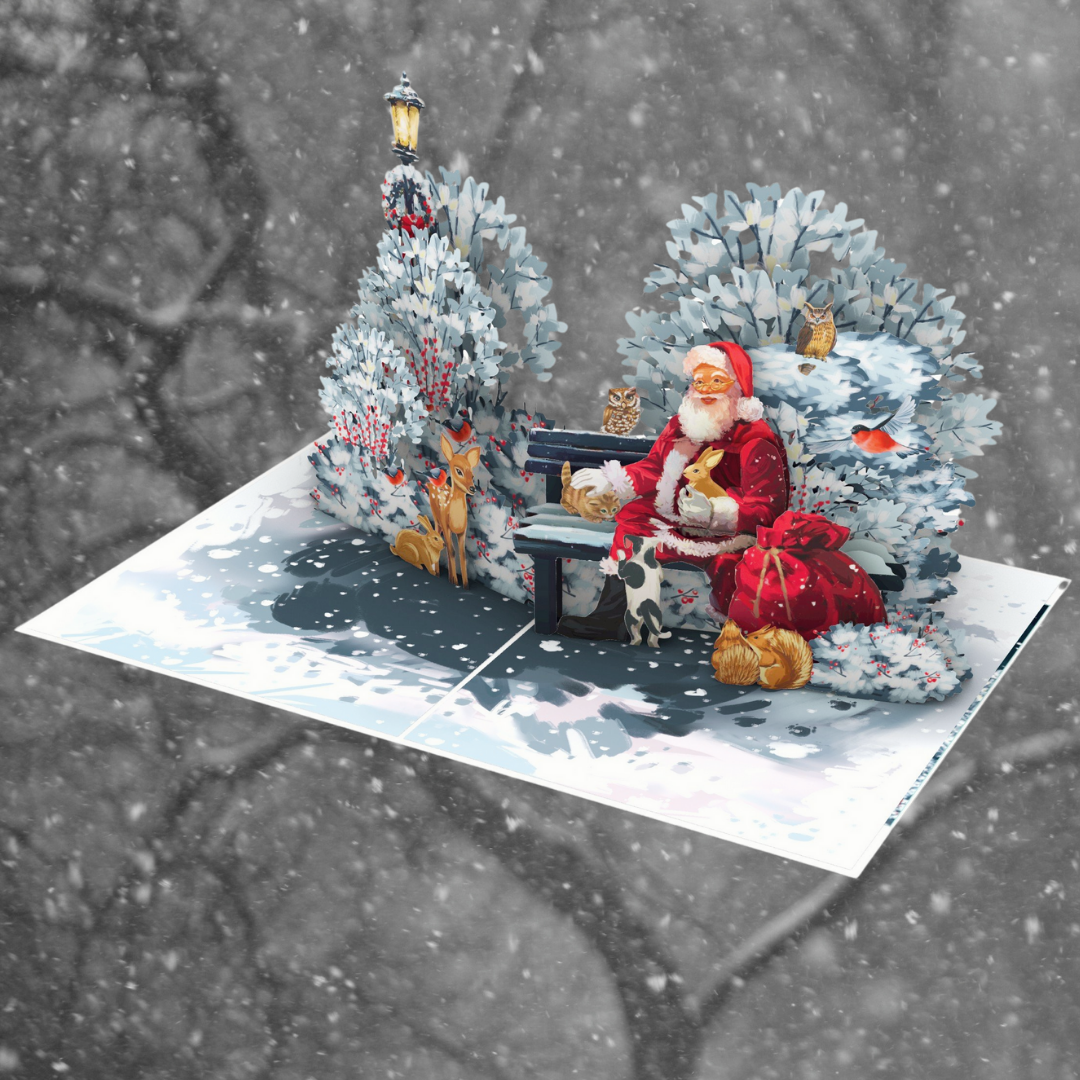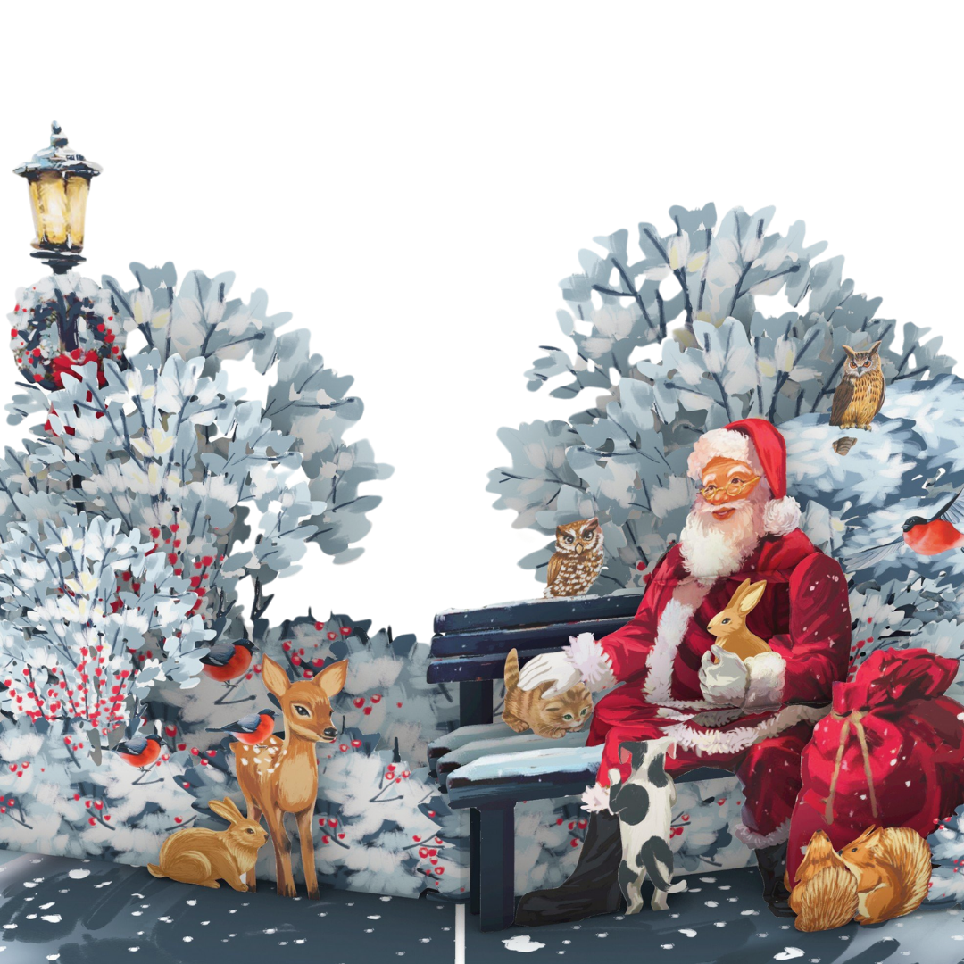 This enchanting 13x18 cm pop-up Christmas card beautifully captures the spirit of the season with a detailed and festive winter scene. Featuring a cheerful Santa Claus sitting on a snowy bench, the card bursts into life when opened, revealing Santa surrounded by woodland creatures such as deer, owls, squirrels, and rabbits. The snowy trees decorated with winter berries and the glowing lamppost add a cozy holiday charm, while Santa holds a sack of gifts, symbolising the joy of giving.