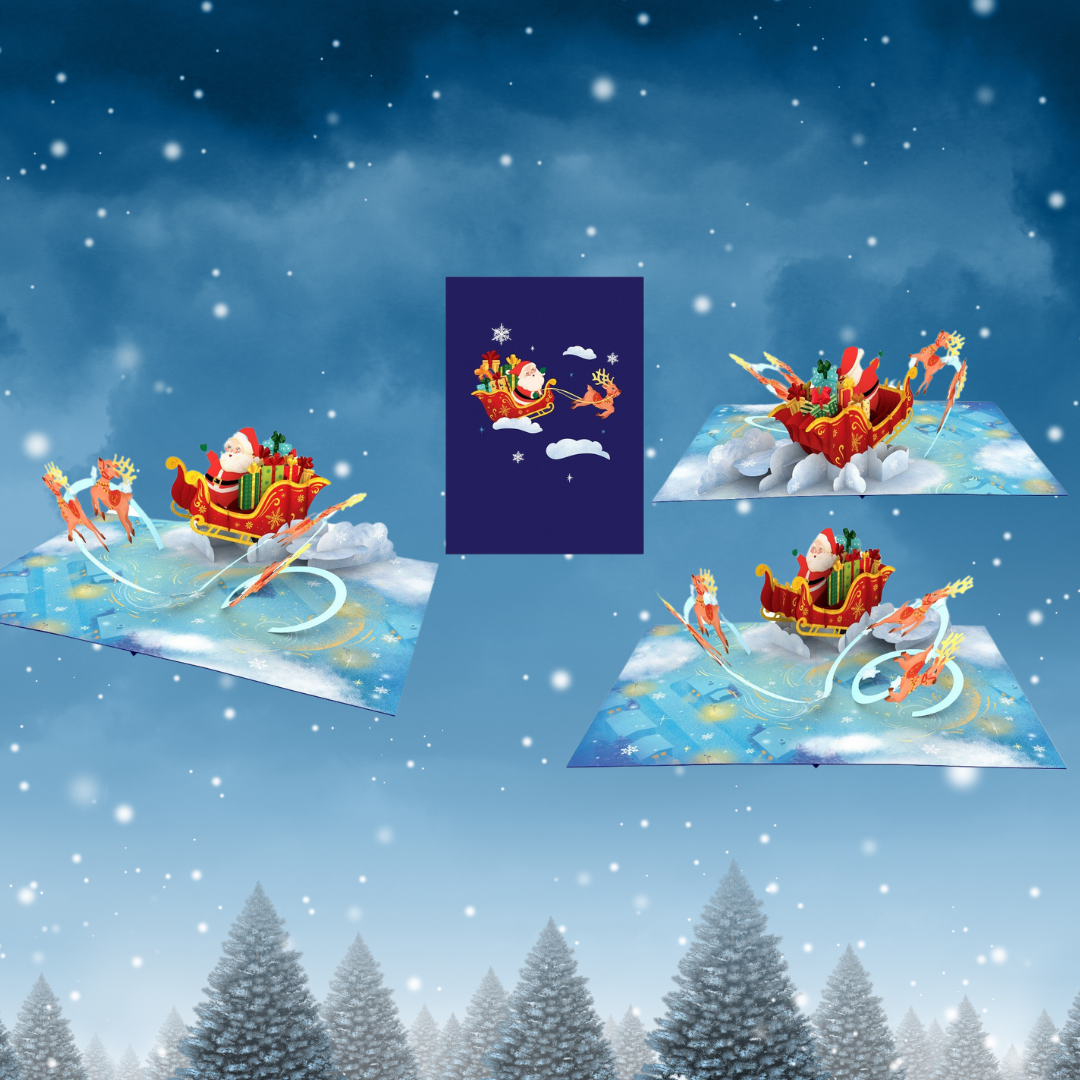 Christmas Santa on sleigh with reindeers 3D pop up greeting card