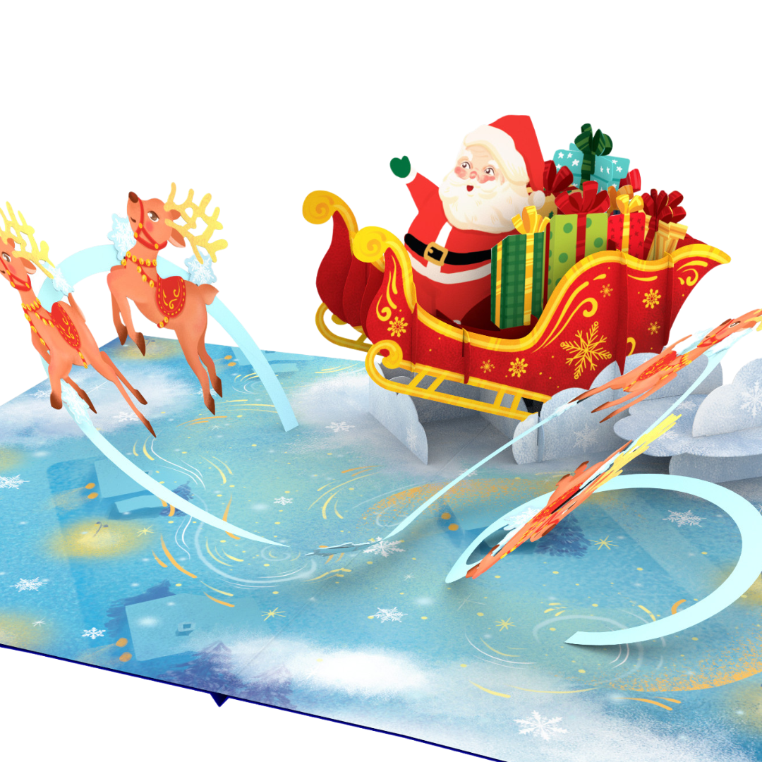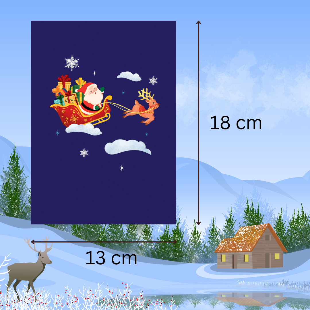 This charming 13x18 cm pop-up card features a festive scene of Santa Claus riding his sleigh, guided by two vibrant reindeer. The intricate 3D design showcases Santa in a beautifully decorated red sleigh, filled with colorful gifts. The reindeer, mid-flight, are playfully depicted soaring over a snowy, icy landscape. Swirling patterns on the ground give the illusion of motion, enhancing the lively and cheerful ambiance. The attention to detail, including snowflakes and festive decorations, makes this card a delightful holiday greeting perfect for spreading joy during the Christmas season. A blue cover with a whimsical illustration of Santa's sleigh complements the intricate pop-up inside. Ideal for anyone looking to send a special holiday message.