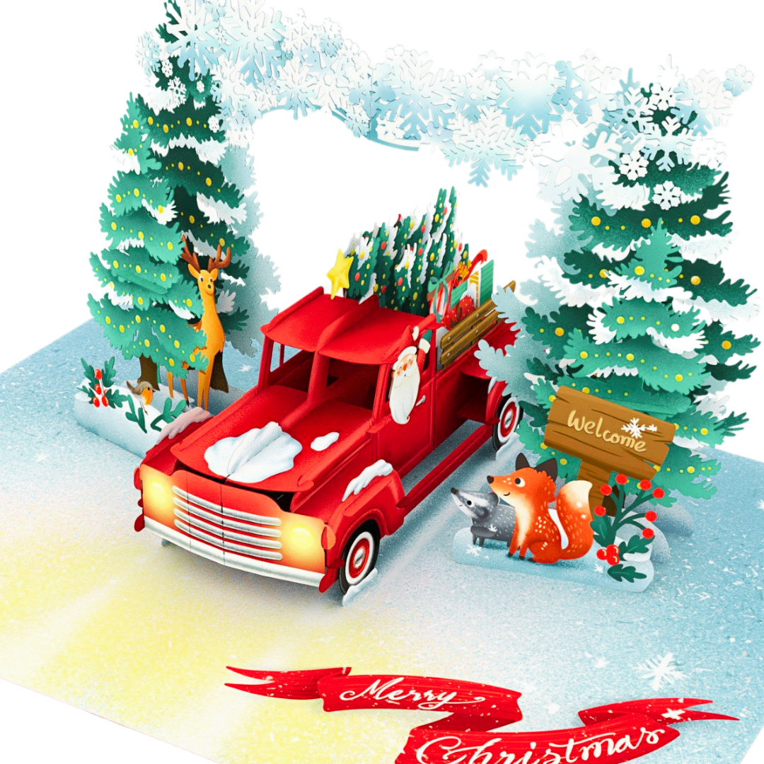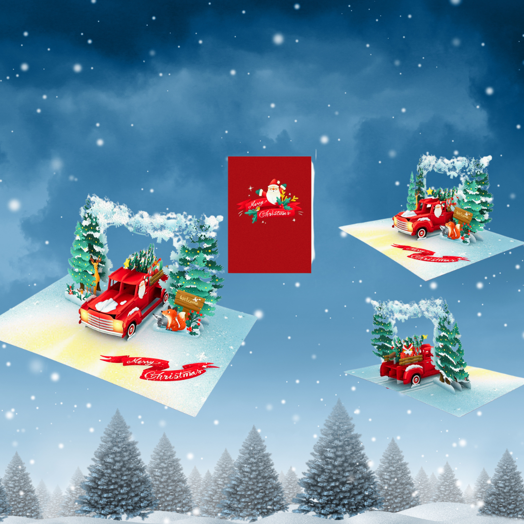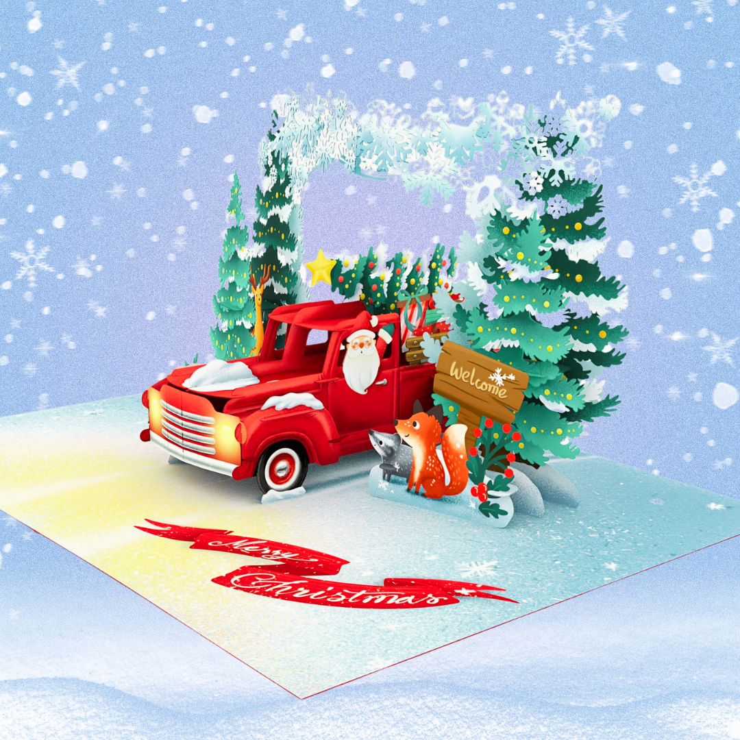 Introducing our delightful Christmas-themed pop-up card, sized at a compact 13x18 cm. This card features a vibrant red vintage truck driven by Santa, accompanied by festive details such as snow-covered trees, woodland animals, and a "Welcome" sign, all intricately designed to bring the holiday spirit to life. The truck, adorned with snow and carrying Christmas trees, creates a warm and inviting scene of Santa delivering joy.