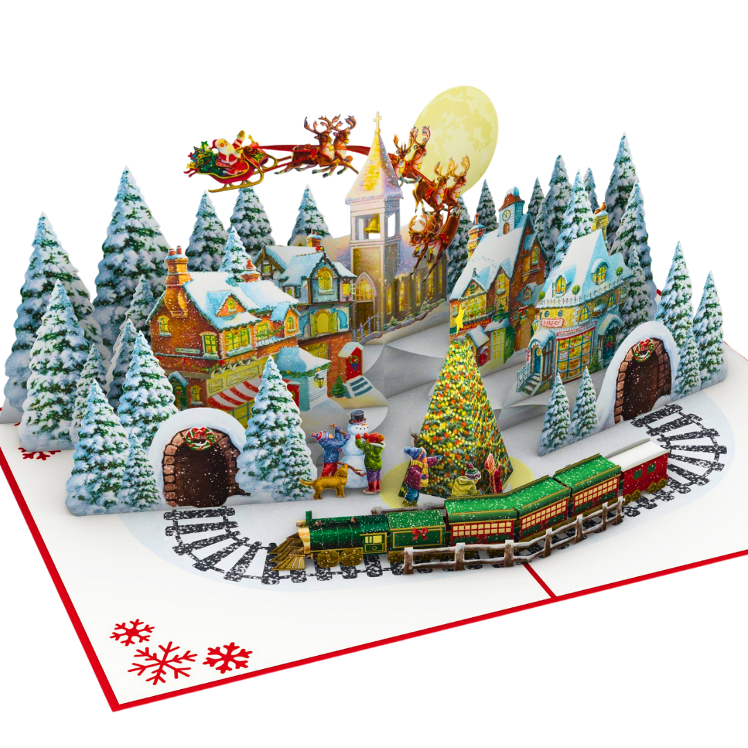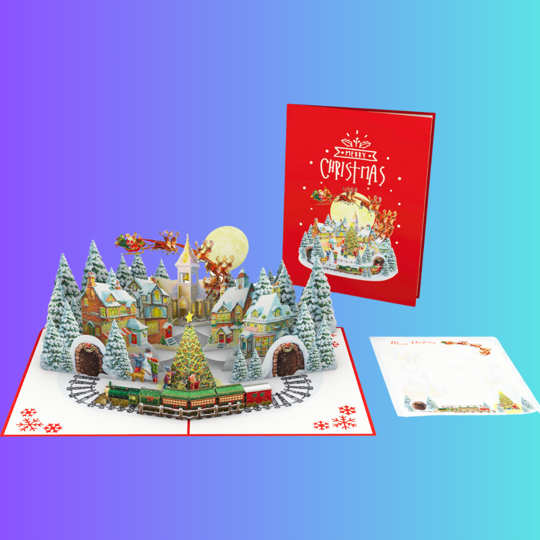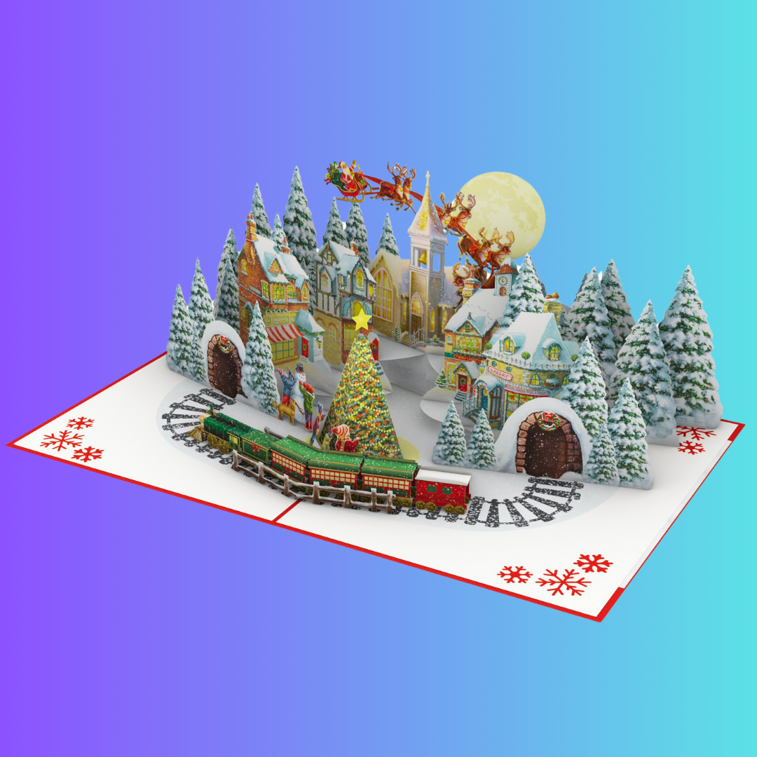 This 15x20 cm Christmas pop-up card presents a stunning, festive winter scene. The centerpiece is a detailed Christmas village surrounded by snow-covered trees and a beautifully decorated Christmas tree. The village is filled with charming buildings, giving a quaint, cozy feel. A small green train runs on tracks around the village, enhancing the winter wonderland atmosphere. Above the village, Santa Claus is flying across the sky in his sleigh, pulled by reindeer, with a full moon shining behind him. The card opens up to reveal these vibrant 3D elements, making it a delightful holiday keepsake. Perfect for sending warm Christmas greetings or as a unique holiday decoration.