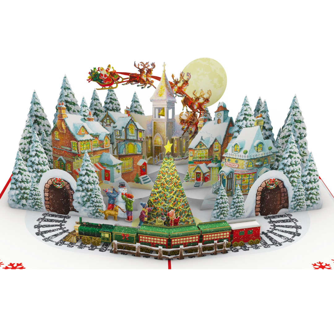 Christmas Village and train, Santa on sleigh and reindeer 3D pop up greeting card