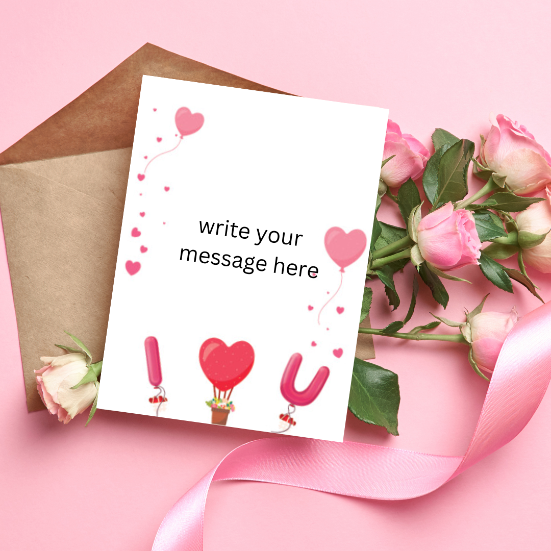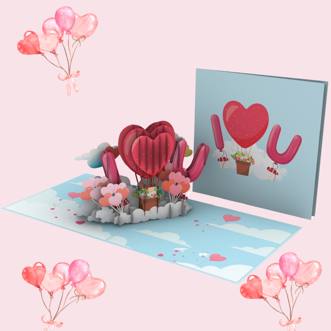 The background of the card features a soft blue sky with the phrase "I ♥ U" spelled out in bold, floating letters, with the heart as a buoyant balloon, adding a playful touch to the message. This whimsical detail adds depth and a touch of whimsy to the already enchanting scene.