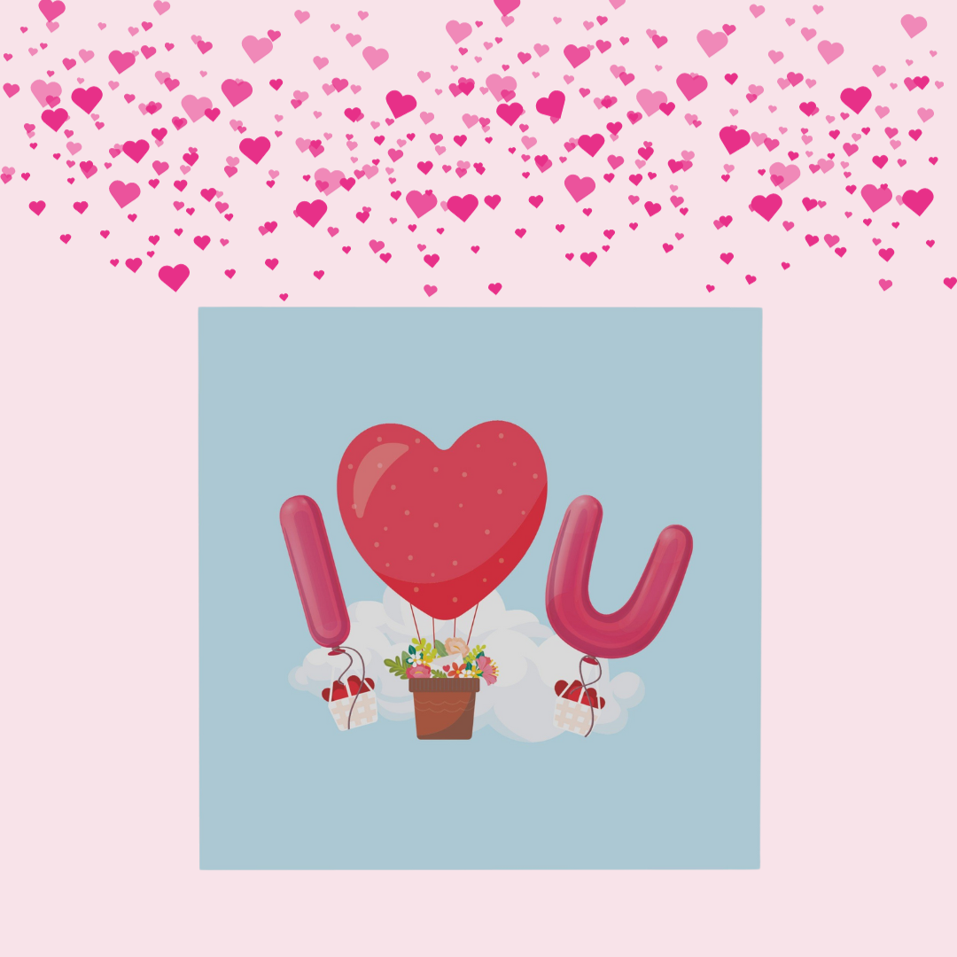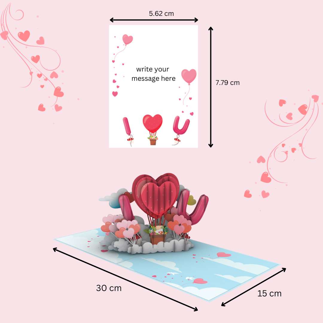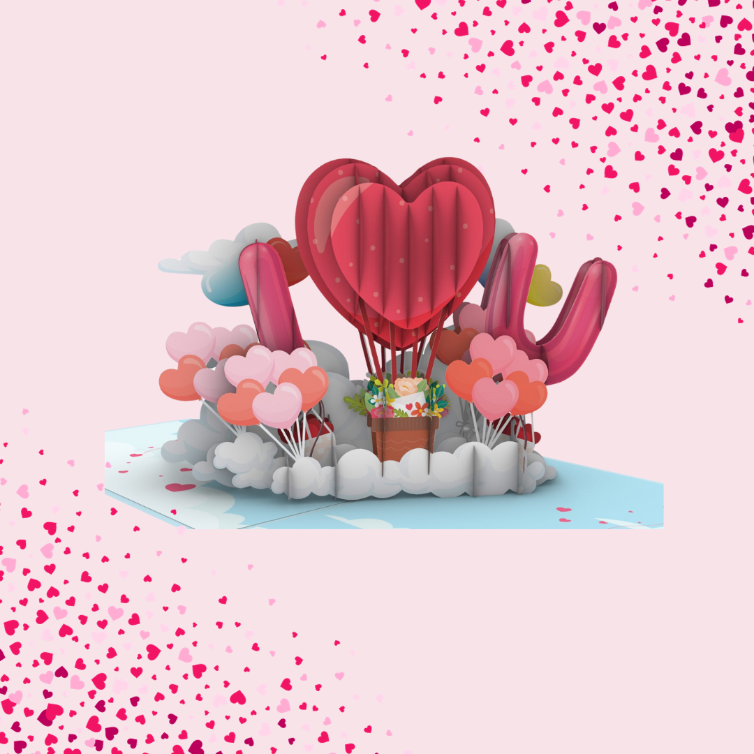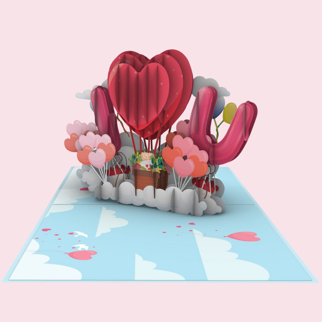 Upon unveiling, the card reveals a central bouquet of vibrant red and pink hearts that appear to be blooming from a cluster of clouds, symbolising love in full bloom. These hearts are cleverly designed to create a larger heart shape in the center, further enhancing the theme of love and togetherness. Flanked by lush, smaller heart-shaped balloons, the scene is both dynamic and tender.