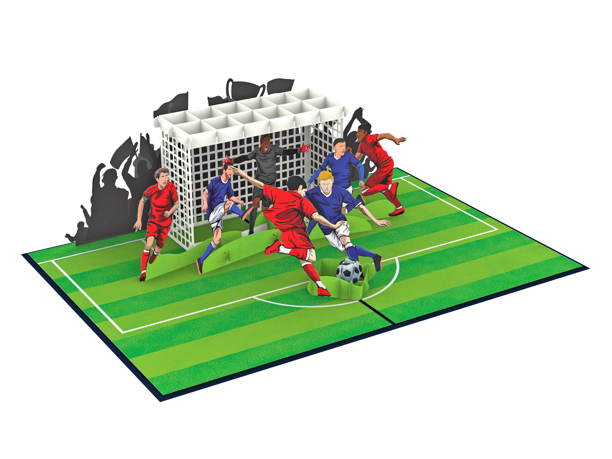 Celebrate the passion for football with this unique 3D pop-up card! Featuring a striking black cover with a football icon, the inside reveals an impressive scene of a goalkeeper making a heroic save in front of a large 3D football. The green football pitch adds a realistic touch, making this card perfect for football enthusiasts. Ideal for birthdays, team celebrations, or just to show support for a football lover. The card measures 15x20 cm, ensuring ample space to add your personalised message.