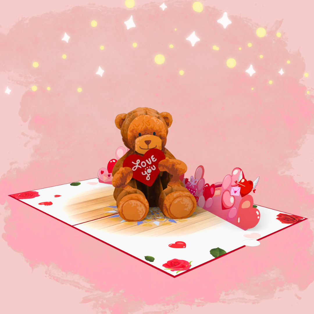 Love Bear pop up card Cuddly Love - Teddy Bear and Hearts 3D Pop-Up Card Valentines Day Anniversary Wedding Engagement greeting card