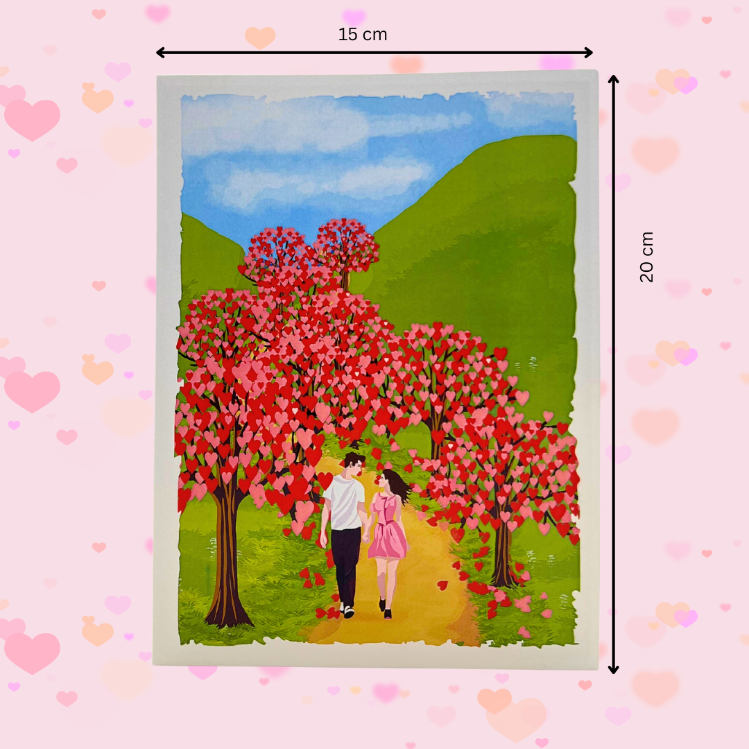 Discover the enchanting allure of our exclusive 'Heart Tree Avenue' 3D Pop-Up Card. As you open this masterpiece, measuring an impressive 20x30 cm, you are greeted by an idyllic scene where romance comes alive. Each tree, laden with rich red heart-shaped leaves, forms a breathtaking canopy over a tender couple strolling down the path of love. Crafted with precision and artistic flair, this card captures the essence of affection and the serenity of nature's beauty. It's an extraordinary gift for your significant other on Valentine's Day, anniversaries, or to simply say 'I cherish you.' This piece of art folds neatly into a bespoke envelope, poised to bring joy and a touch of whimsy to your loved one's day.