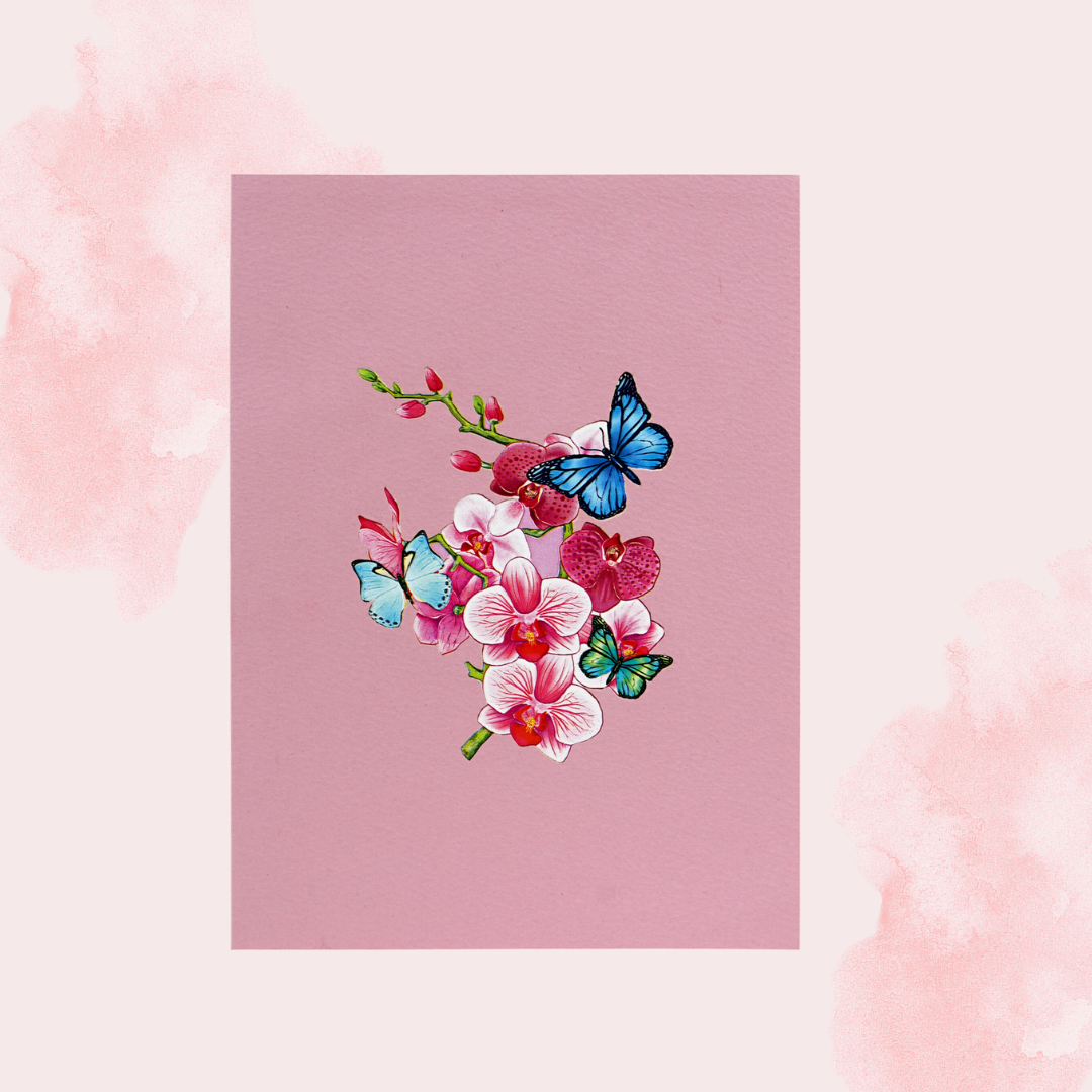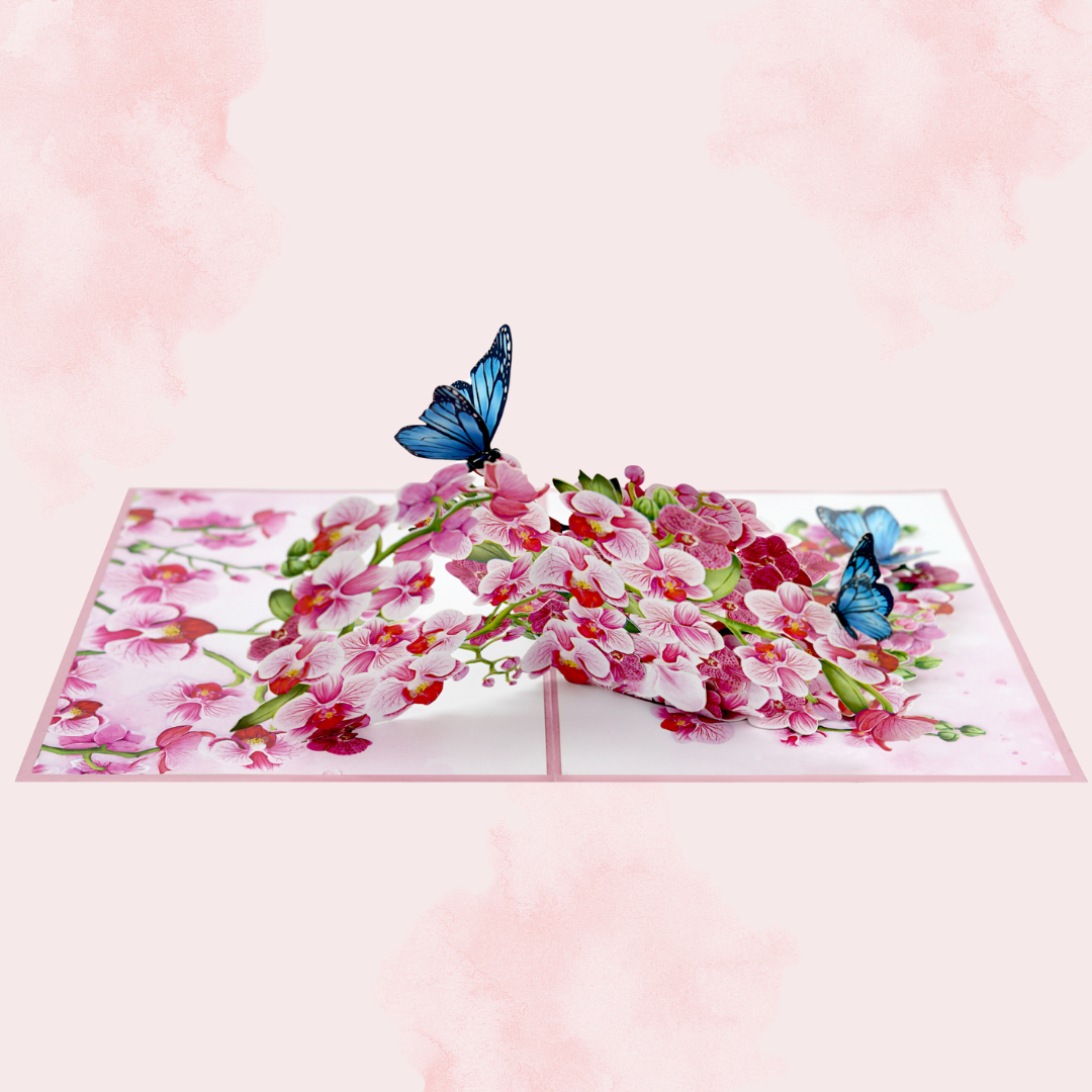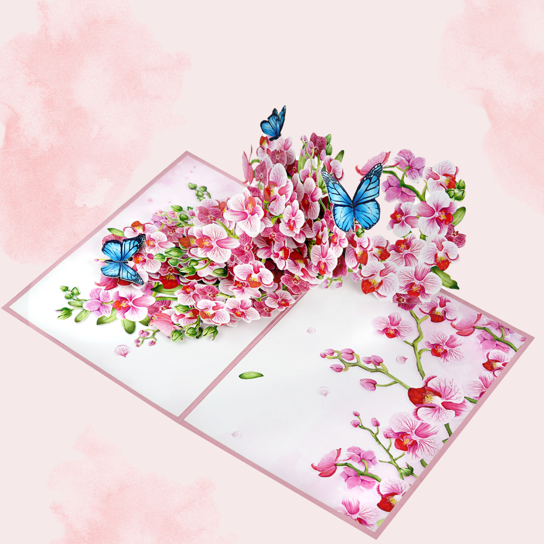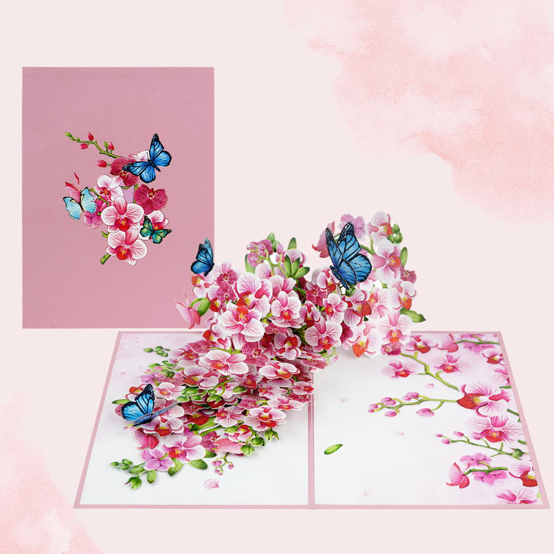 Delight your loved ones with this stunning pop-up card featuring a cascade of pink orchids adorned with vibrant blue butterflies. The intricately designed flowers bloom beautifully when the card is opened, creating an enchanting three-dimensional effect that brings nature to life. Perfect for special occasions such as birthdays, anniversaries, or just to show someone how much you care, this card is a memorable keepsake. The cover features a delicate orchid and butterfly illustration, complementing the intricate surprise inside.