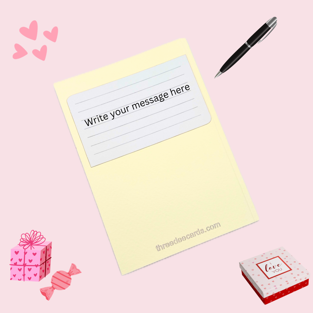 Experience the magic of affection with our 'Whispers of Love' 3D Pop-Up Card. Upon opening, a romantic scene unfolds featuring two intricately designed heart trees, their branches laden with deep red hearts that seem to float and flutter in an invisible breeze. At the base of this arbours alcove, a silhouette of a couple shares a tender moment on a bench, symbolising a timeless love story. The vivid green grass, dotted with fallen hearts, leads to the serene blue waters, adding a touch of tranquility to the scene. This card is not merely a greeting; it's a displayable piece of art that promises to evoke emotions and capture the imagination. Perfect for anniversaries, Valentine's Day, or to convey a message of love, this card beautifully encapsulates the essence of passion and companionship.