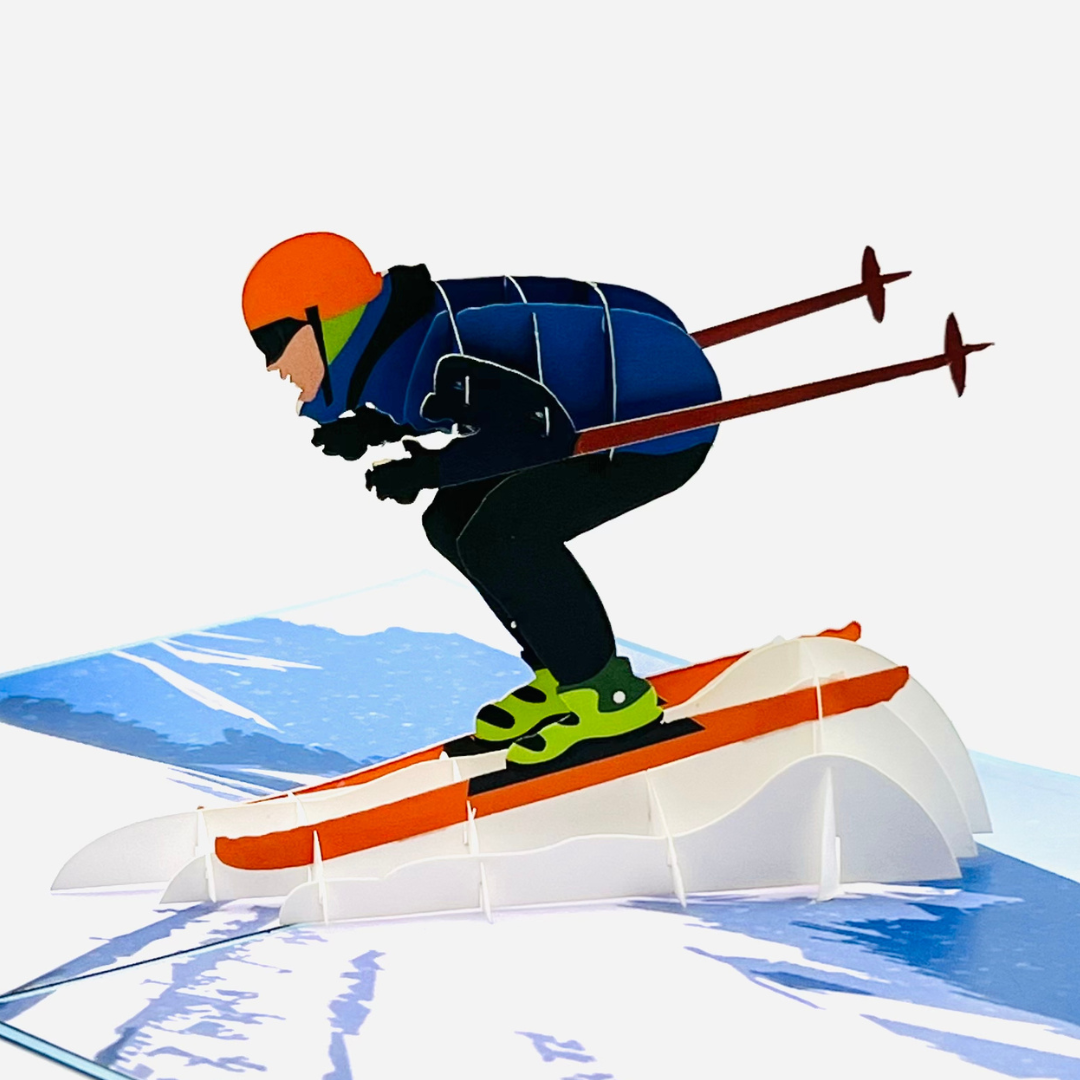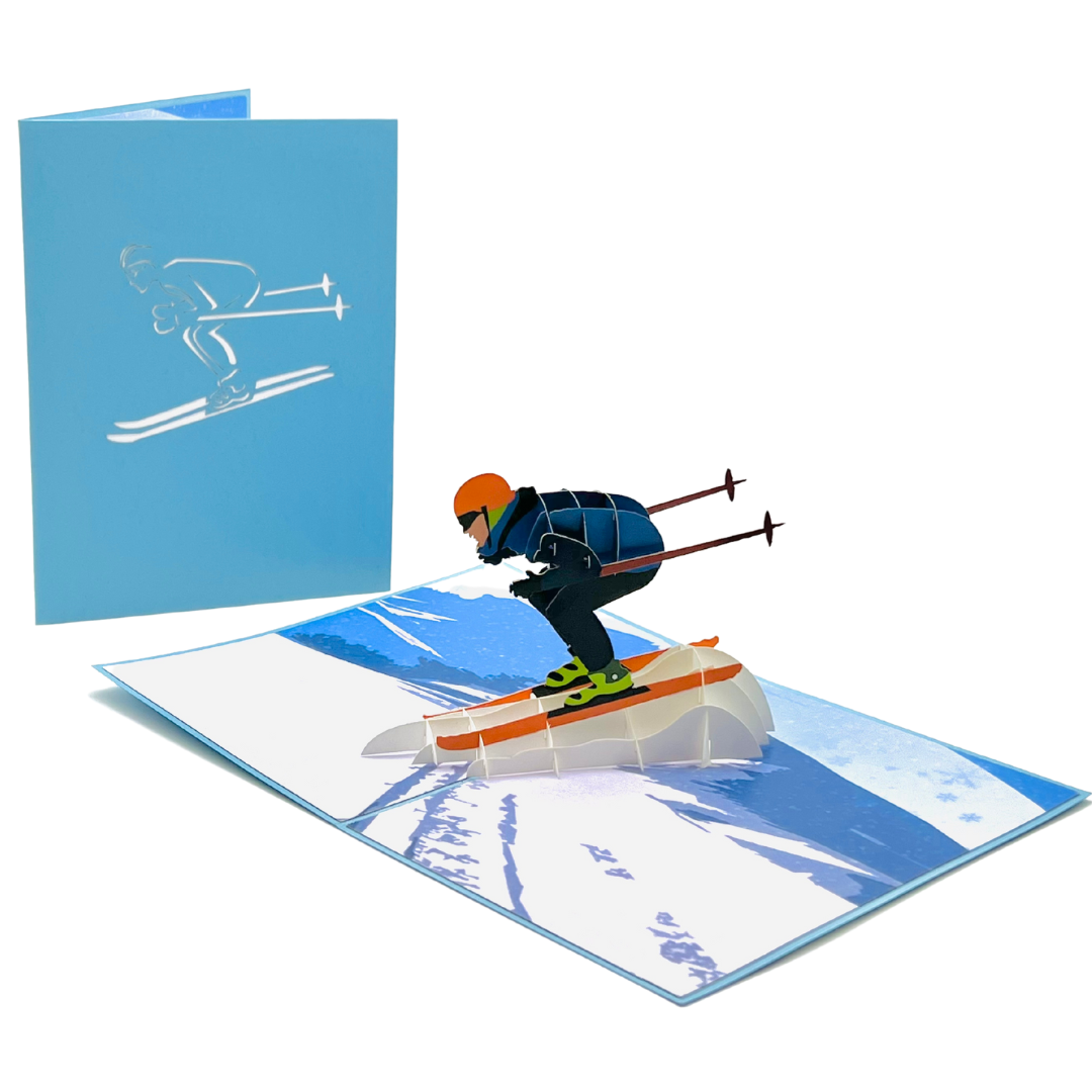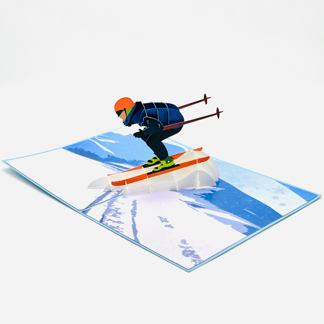 Experience the thrill of skiing in this action-packed 3D pop-up card! The cover features a sleek silhouette of a skier in mid-action, giving a hint of the adventure waiting inside. As you open the card, a dynamic 3D skier bursts onto the scene, perfectly poised as they race down a snow-covered mountain. The vivid details capture the excitement of skiing, from the skier’s streamlined posture to the mountain backdrop. Ideal for winter sports enthusiasts, birthdays, or anyone who loves the rush of the slopes.