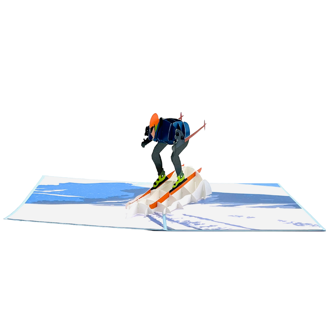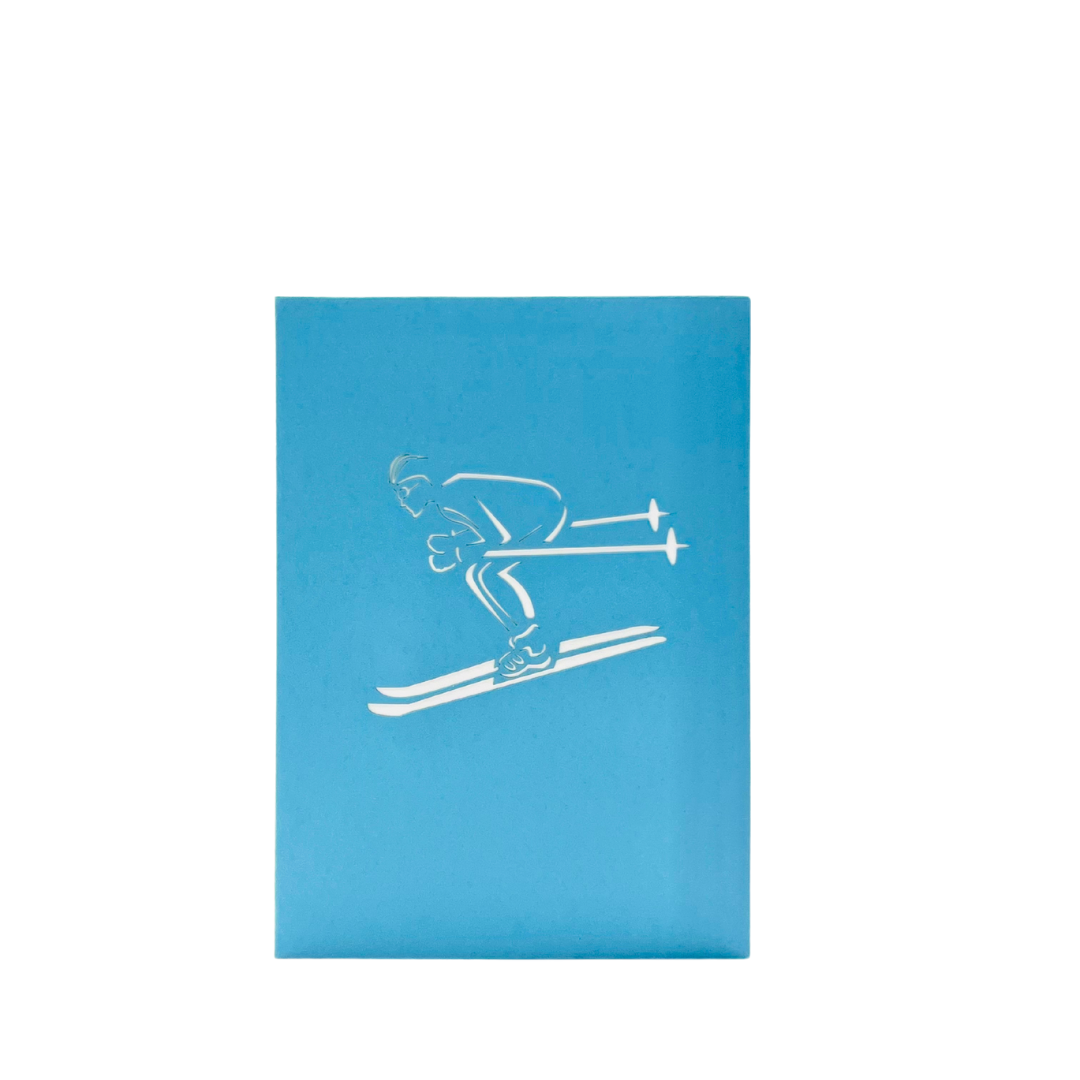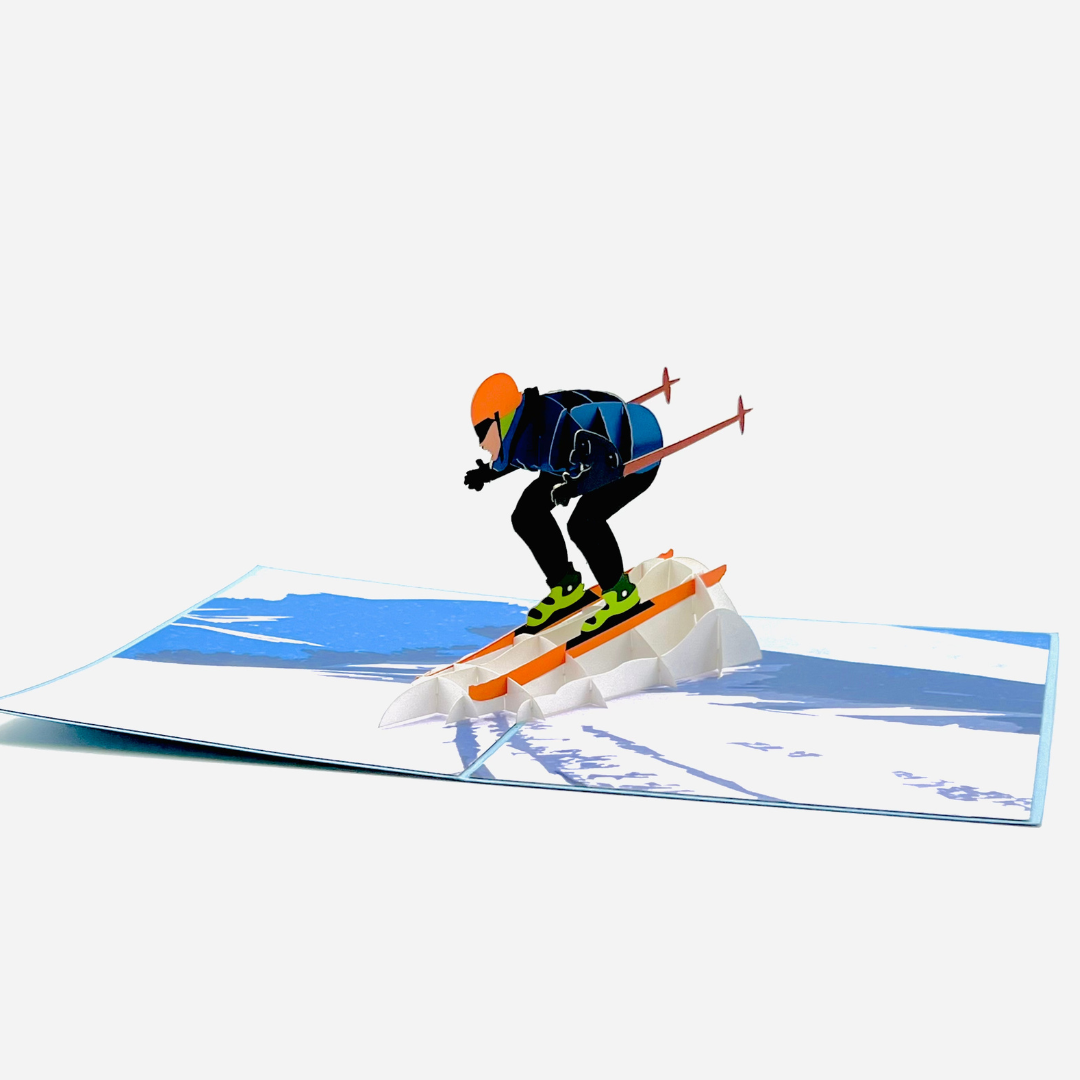 Experience the thrill of skiing in this action-packed 3D pop-up card! The cover features a sleek silhouette of a skier in mid-action, giving a hint of the adventure waiting inside. As you open the card, a dynamic 3D skier bursts onto the scene, perfectly poised as they race down a snow-covered mountain. The vivid details capture the excitement of skiing, from the skier’s streamlined posture to the mountain backdrop. Ideal for winter sports enthusiasts, birthdays, or anyone who loves the rush of the slopes.