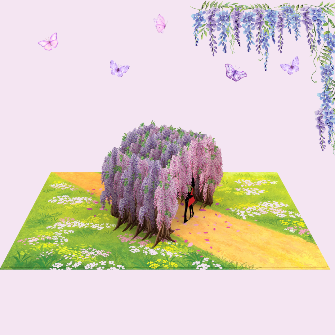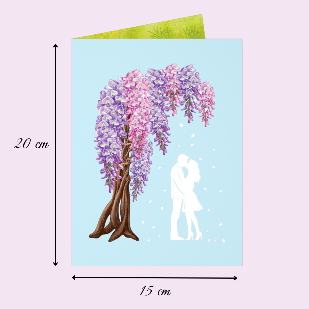 This beautiful 3D pop-up card, sized 15 x 20 cm, captures the romantic ambiance of a serene garden path framed by cascading wisteria flowers. At the center of this enchanting scene, a couple is sharing a tender moment under a stunning wisteria canopy, creating a perfect display of love and connection.